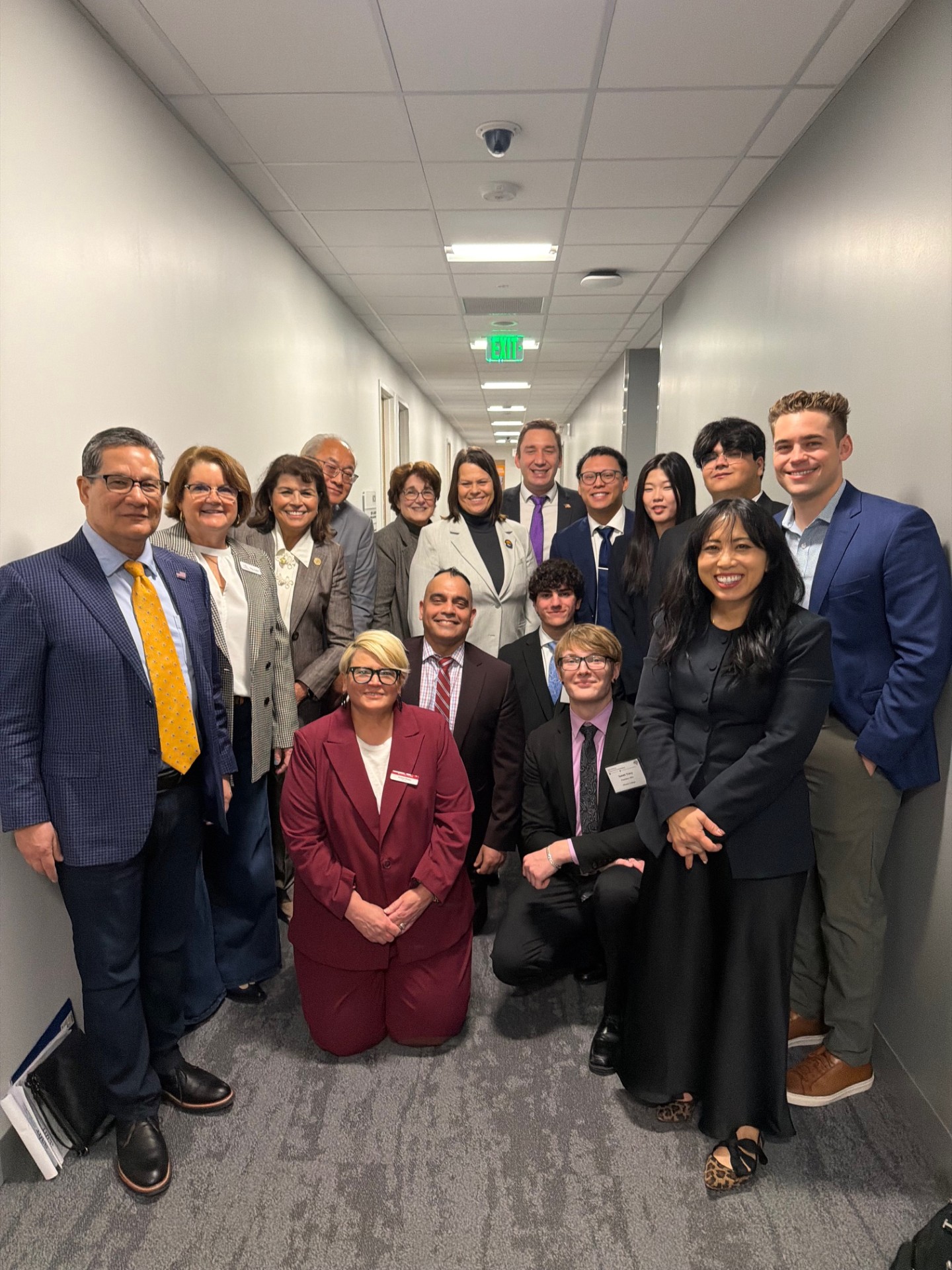 Above right: Foothill-De Anza Community College District staff, Assemblymember Marc Berman (center), and West Valley/Mission Community College District staff; above left: Assemblymember Patrick Ahrens (center, back) with staff from both community college districts