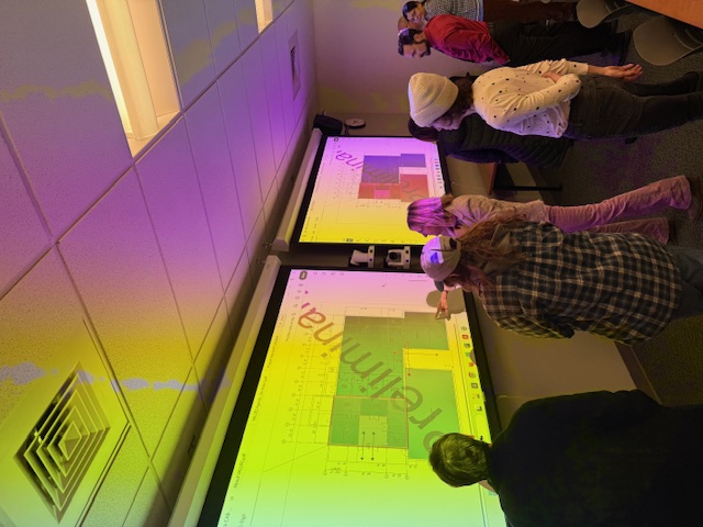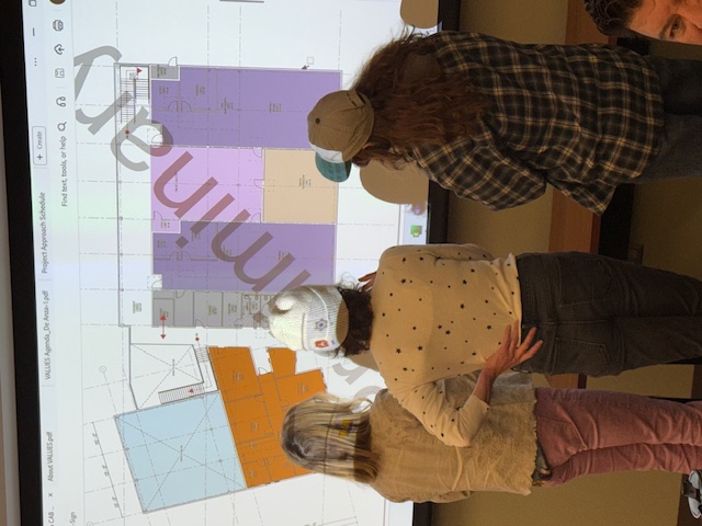 Above: Meeting attendees view and comment on preliminary concepts for the Creative Arts Building. Left photo: (left to right) Lisa Teng, Alyssa Vanzandt, Kristin Skager, Julie Hughes, Roseanne Sciacchitano, Erik Woodbury, Shagun Kaur; right photo (left to right): Kristin Skager, Julie Hughes, Alyssa Vanzandt
